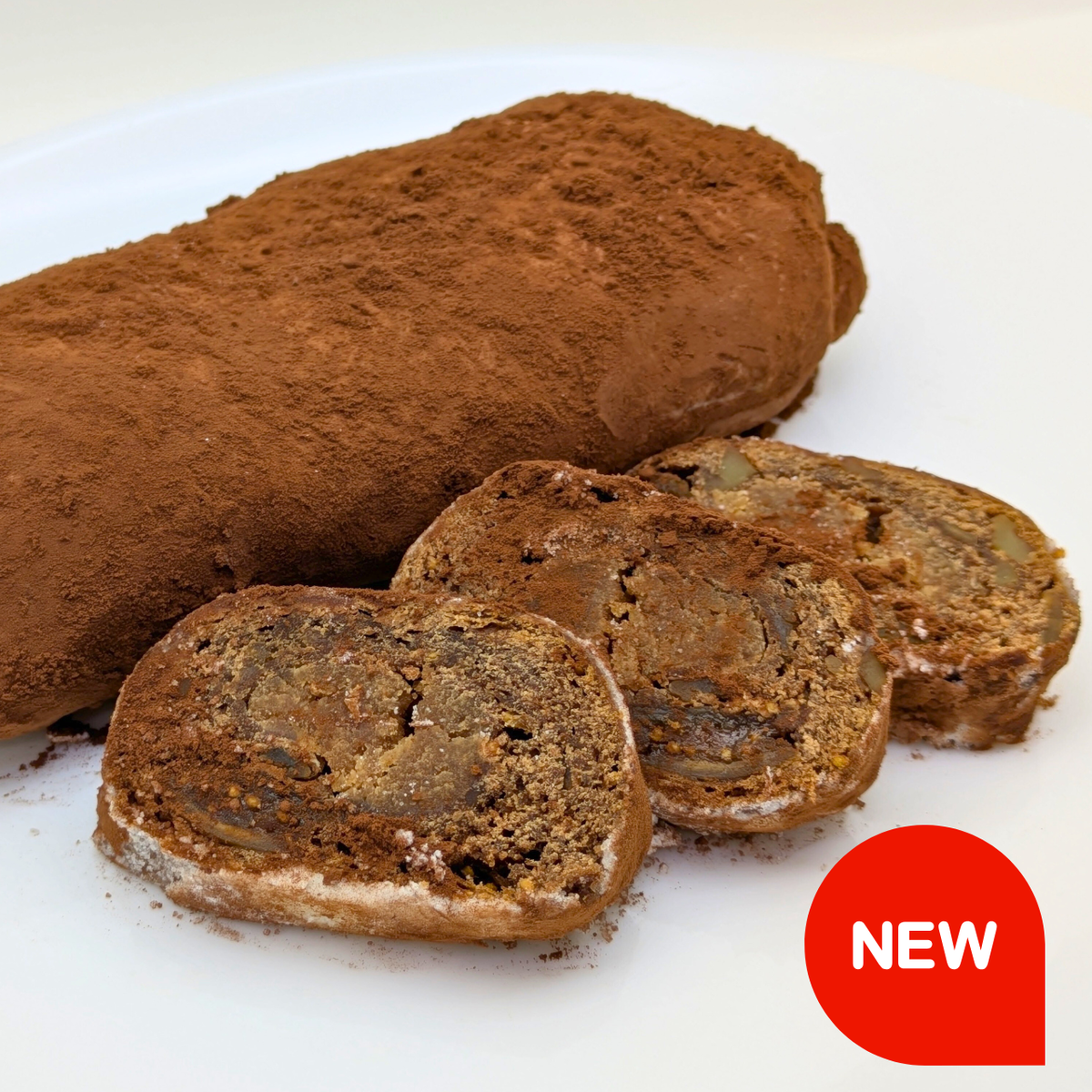 カカオベースの生地にいちじく・クルミ・デーツなどふんだんに練り込み、風味豊かで程よい甘さのマロンとアーモンドのペーストを包み焼き上げました。