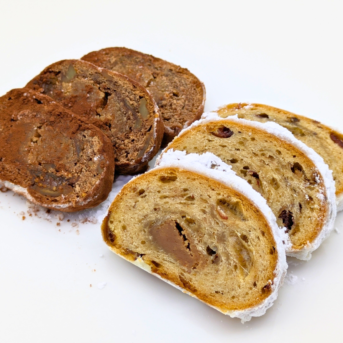 日が経つにつれてドライフルーツの味が生地に馴染み、味わいが深まっていく変化をお楽しみいただけます。それぞれに美味しいふたつの異なる風味を、薄くスライスしてゆっくりとお召し上がりください。