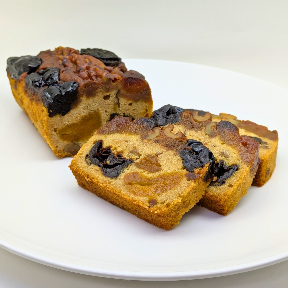 あんず・プルーン・クランベリーなどのドライフルーツや、香ばしいクルミを贅沢に使い、洋酒を纏わせじっくり3ヶ月熟成。